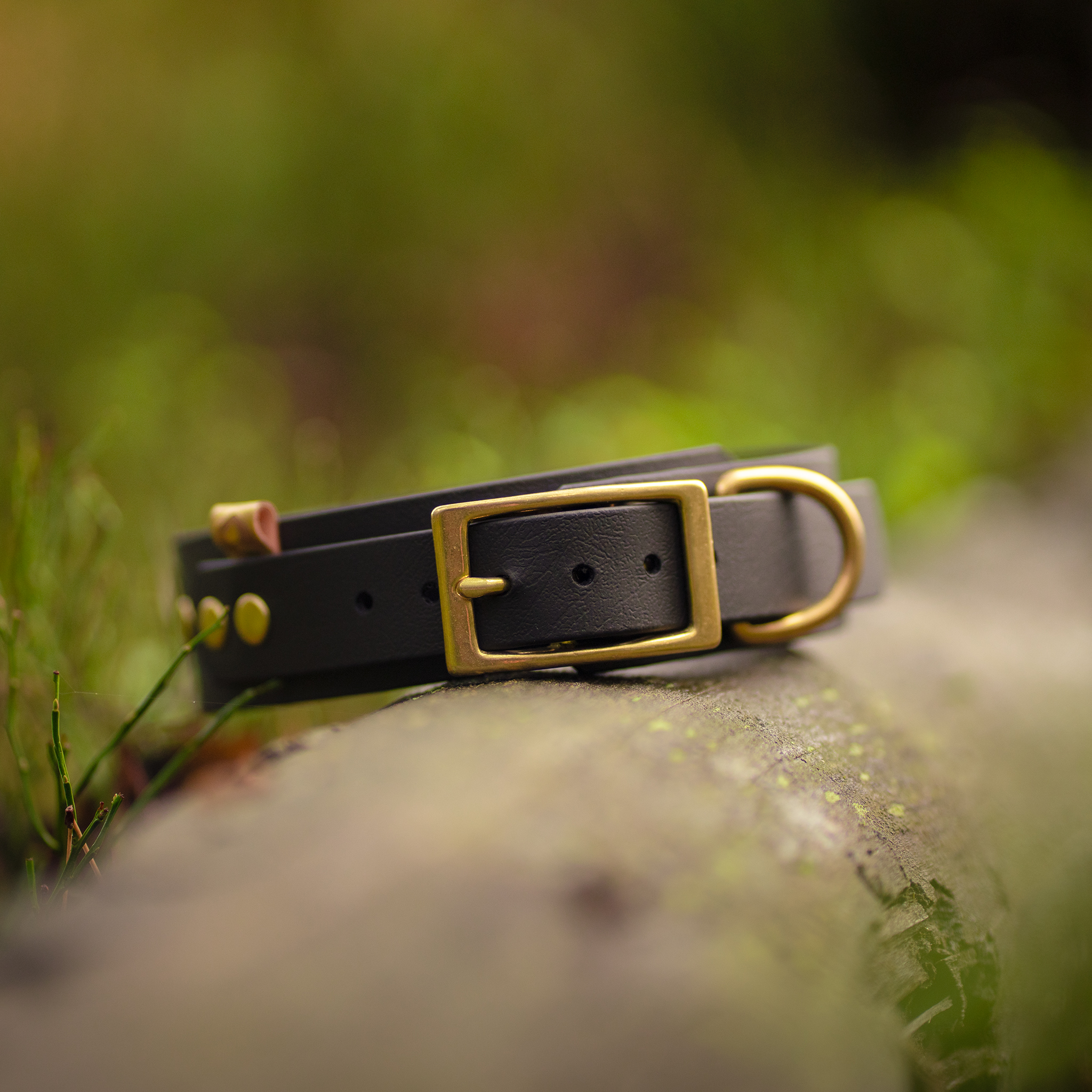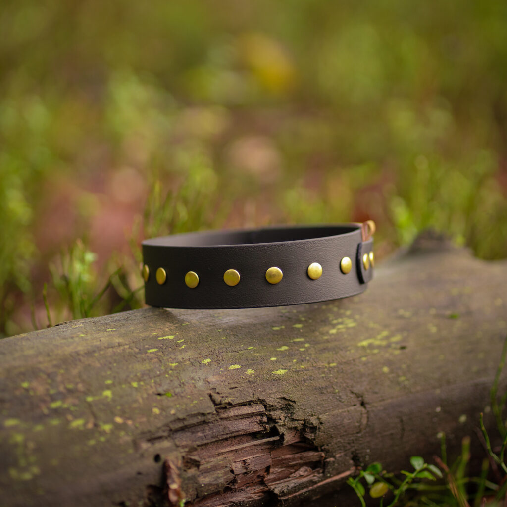 - Mosiężne nity: Mają ciepły, złoty odcień, który doskonale współgra z ciemniejszymi kolorami obroży, takimi jak czarny, brązowy lub oliwkowy. Dają obroży klasyczny, elegancki wygląd.